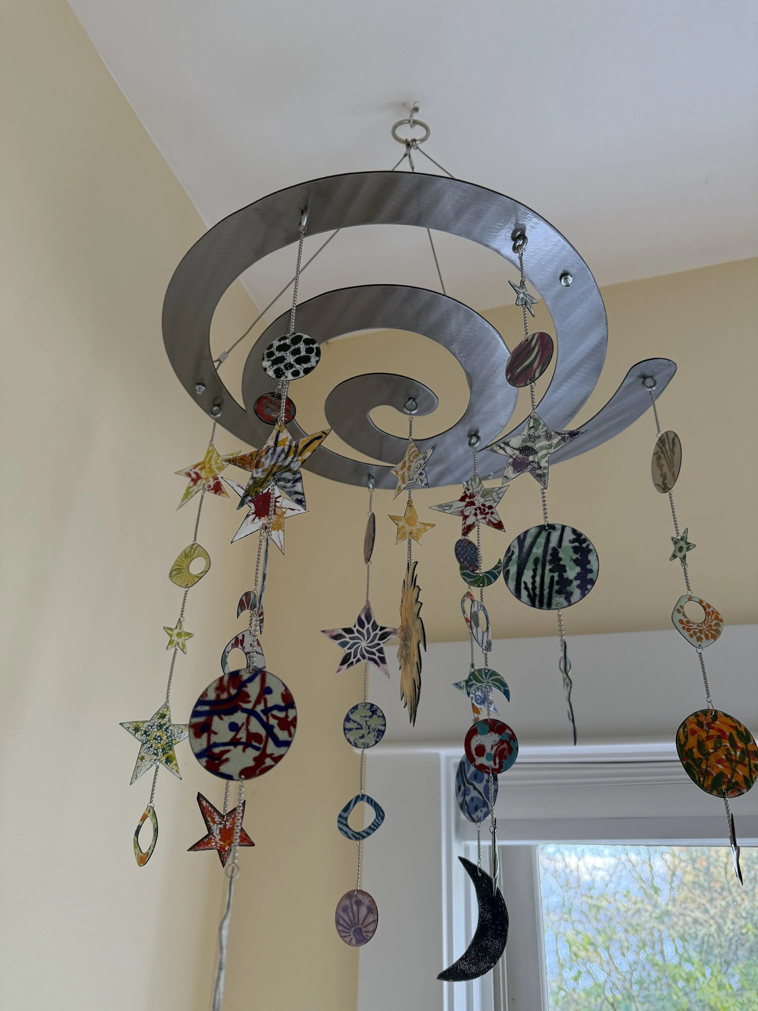 I also love to express myself visually. I have dabbled in a variety of medium, beginning with embroidery, then printmaking & paper collage. I then turned my scope to beaded jewelry. From there, basket weaving. Currently, I make woven sculptures as well as enamel and metal mobiles.